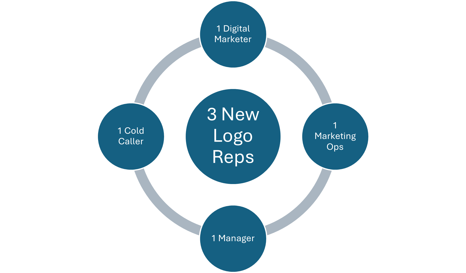The above diagram illustrates the concept of a Unit of Production. Every 3 new logo reps will require one FTE Cold caller, one marketing ops, and one digital marketer. When you hit three sellers, you’ll need to hire a dedicated sales leader. But only hire that role when you have two of the three sellers hitting quota. Otherwise you’ll bury yourself in overhead and never get out of it. These new reps need to work with the founder, get the founder’s stories, get the passion and urgency, and sense the upward mobility to the sales manager opportunity.